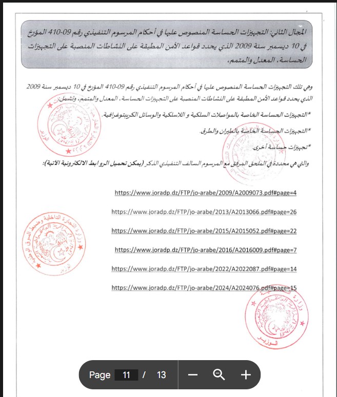 التجهيزات الحساسة المنصوص عليها في أحكام المرسوم التنفيذي رقم 09-410 المؤرخ في 10 ديسمبر سنة 2009 الذي يحدد قواعد الأمن المطبقة على الأنشطة المتمثلة في التجهيزات الحساسة، المعدل والمتمم.